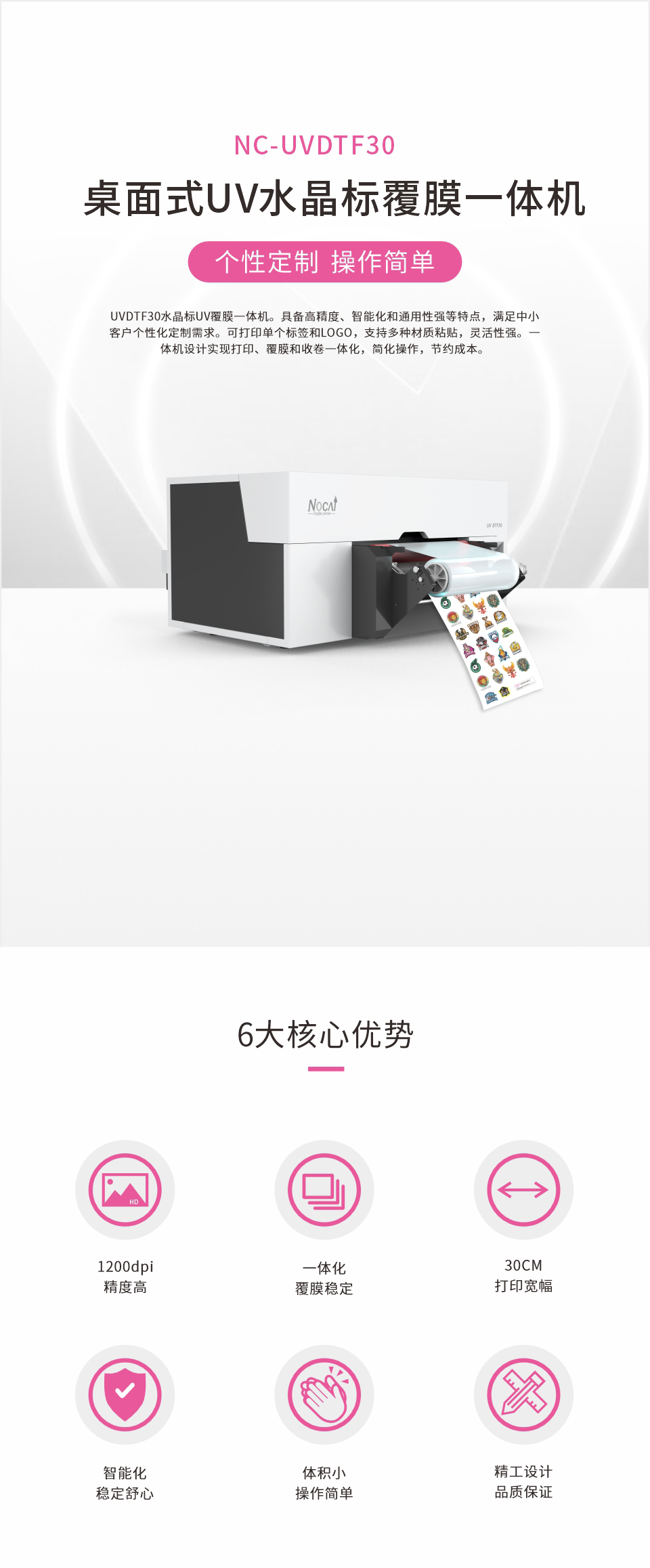 UVDTF30打印機,集放料、撕膜、打印、覆膜于一體,減少繁瑣操作,省時省人工。全自動撕膜覆膜,實現(xiàn)一體化智能生產(chǎn)。