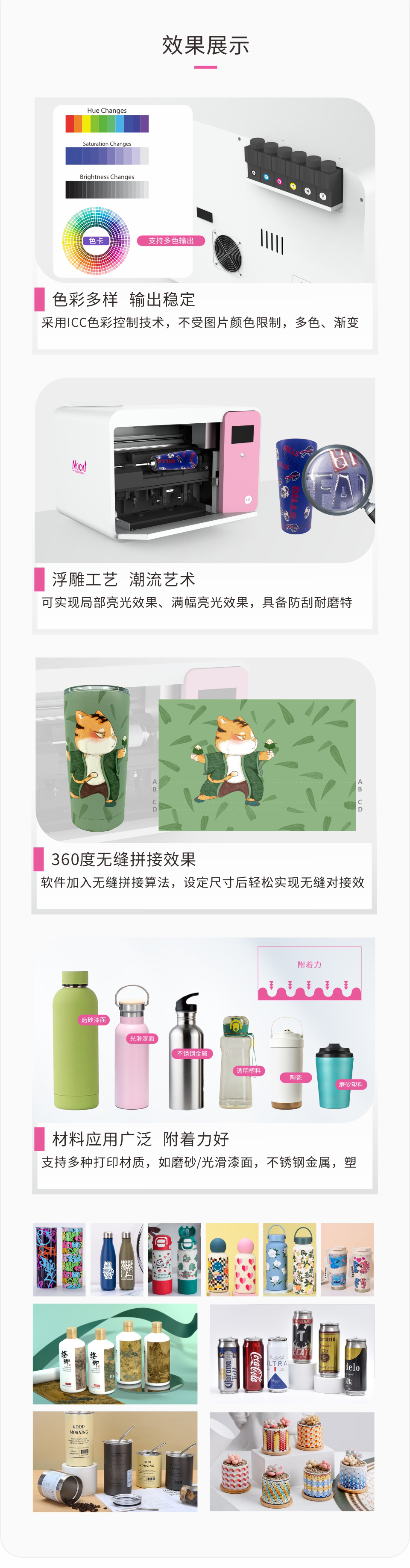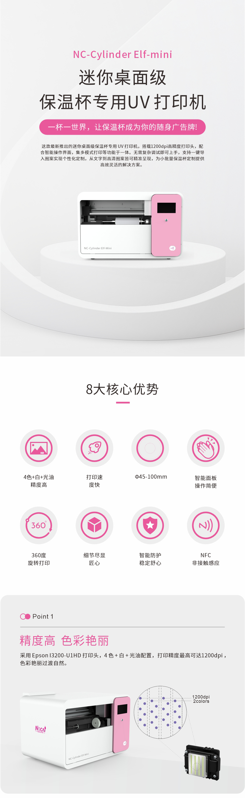 采用 Epson I3200-U1HD 打印頭,4 色 + 白 + 光油配置,打印精度最高可達(dá)1200dpi ,色彩艷麗過渡自然。